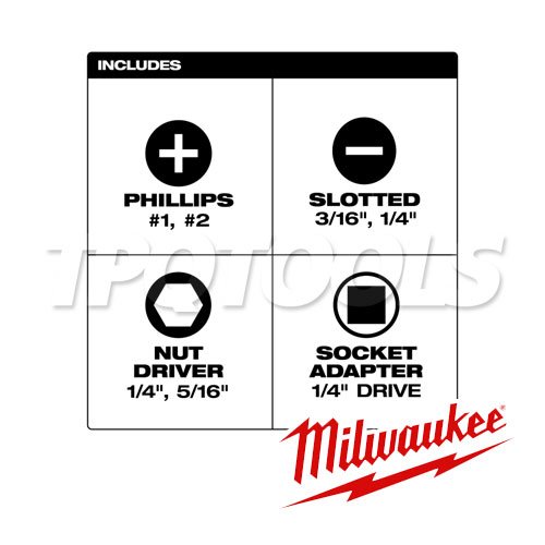 • 7in1: บิต PH1, PH2, SL1/4 และ SL 3/16; อะแดปเตอร์ซ็อกเก็ต 1/4 นิ้ว; ไขควงหัวน็อต 1/4 นิ้ว และ 5/16 นิ้ว