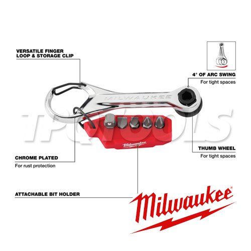 ประแจขันอเนกประสงค์แบบ 7-in-1 Multi-Bit Mini Ratchet ของเราช่วยให้เข้าถึงพื้นที่แคบได้ดีขึ้นด้วยมุมโค้ง 4° ประแจขันอเนกประสงค์แบบ 7-in-1 นี้มาพร้อมห่วงคล้องนิ้วอเนกประสงค์และคลิปหนีบเพื่อการควบคุมที่สะดวกและการจัดเก็บที่ง่ายดาย ที่จับดอกสว่านแบบติดได้ช่วยให้เข้าถึงดอกสว่านได้ง่ายและจัดระเบียบได้ดีขึ้น ปุ่มหมุนสำหรับขันและคลายตัวยึดเมื่อมีพื้นที่จำกัด ประแจขันอเนกประสงค์แบบ 7-in-1 ของ Milwaukee®