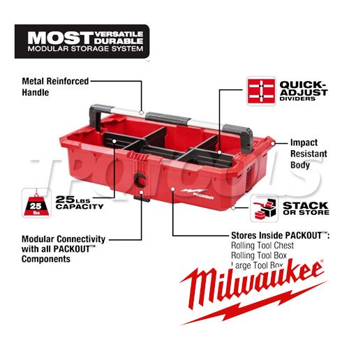 ถาดเครื่องมือ PACKOUT™ ของเรามีฟังก์ชันการทำงานแบบกองหรือจัดเก็บ วางถาดเครื่องมือไว้บนโซลูชัน PACKOUT™ หรือจัดเก็บไว้ภายในกล่องเครื่องมือแบบม้วน PACKOUT™, กล่องเครื่องมือแบบม้วน, กล่องเครื่องมือ XL หรือกล่องเครื่องมือขนาดใหญ่ ถาดเก็บเครื่องมือนี้ช่วยให้คุณปรับแต่งเค้าโครงภายในด้วย Quick-Adjust Dividers ซึ่งสร้างช่องเก็บของแยกกันได้ถึงหกช่อง ความจุน้ำหนัก 25 ปอนด์และด้ามจับเสริมด้วยโลหะช่วยให้คุณขนย้ายเครื่องมือและวัสดุรอบๆ ไซต์งานได้อย่างง่ายดาย MILWAUKEE® PACKOUT™ เป็นระบบจัดเก็บข้อมูลที่ทนทานและอเนกประสงค์ที่สุดในอุตสาหกรรม- การเชื่อมต่อกับส่วนประกอบ PACKOUT ทั้งหมดแบบแยกส่วน